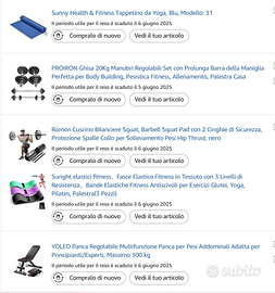 Vendesi attrezzatura completa per home fitness, ideale per chi vuole allenarsi adeguatamente a casa con un unico acquisto. Il kit è stato usato pochissimo ed è in ottime condizioni. Il pacchetto include: - Kit Pesi e Bilanciere (20 kg totali): 2 manubri in acciaio massiccio, barra di prolunga per diventare bilanciere, 4 fermagli e 12 dischi (4x2,5kg, 4x1,25kg, 4x0,5kg). - Panca Multifunzione: Già montata e pronta all'uso. - Set 3 Elastici: Diverse resistenze per stretching e tonificazione. - Accessori Extra: Tappetino fitness e cuscinetto proteggi-collo per bilanciere. Note: Valore commerciale originale: 190€ (verificabile su Amazon). Vendita esclusivamente in blocco. Non vendo pezzi separatamente.