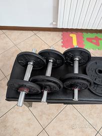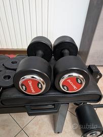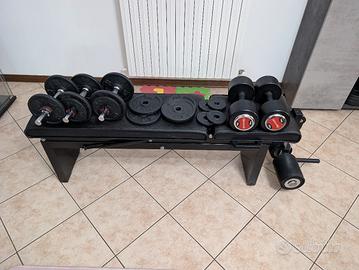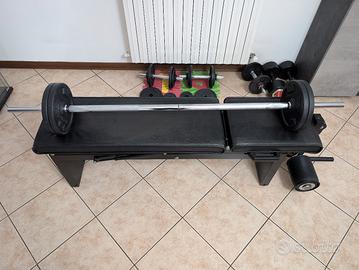 Vendo i seguenti attrezzi per chi volesse esercitarsi un po' a casa. Il set comprende: - panca technogym multipla. la panca può assumere diverse posizioni per allenare petto e addominali. La panca è anche dotata di sistema leg extension. - 2 manubri gommati Diamond da 16 kg - 3 manubri decathlon da 2 kg con i relativi blocchi - 1 bilanciere corto decathlon da xx kg - 4 dischi da 5 kg - 10 dischi da 2 kg - 4 dischi da 1 kg - 4 dischi da 0,5 kg Tutto in ottime condizioni, per non dire perfette!!!! Per questioni di peso si preferisce il ritiro al mio domicilio!!