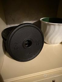 Vendo per inutilizzo panca dechatlon, due manubri con due dischi da 5 per manubrio e fermi. Compresi nel set 8 dischi da 2 kg e 8 dischi da1 kg tutto come nuovo