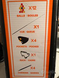 Set per biliardo da tavolo Homepool – Grazie ai 4 angoli, alle 4 barre estensibili, alle 12 palle, alla stecca e al triangolo (che consente di posizionare le palle prima di ogni partita), il biliardo diventa un gioco semplice da praticare ovunque… Basta avere a disposizione un tavolo! Le palle sono rivestite di materiale antiscivolo “effetto velluto”, e la stecca con la punta di gomma consentono di non rovinare la superficie del tavolo. Solo consegna a mano con incontro da organizzare.
