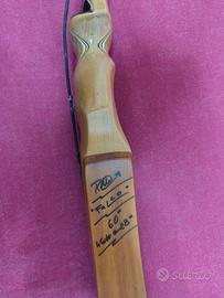 Arco monolitico ricurvo da 46 libbre, modello "FALCO", riser in ulivo e flettenti in tasso, opera d'arte prodotta dal maestro Max Bow (facebook);