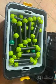 Per cessato utilizzo cedo in blocco set pesini originali Zumba con 12 coppie da 2 Kg e 17 coppie da 1 Kg. I pesini sono contenuti in una specifica cassa con le ruote. Visto il peso il ritiro a carico di chi compra