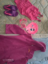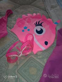Vendesi set piscina per bambina 6/8 anni composto da ciabattine 32-33, accappatoio 8 anni, costume 12 anni ma la mia bambina lo ha indossato a 6/8 anni, cuffietta e occhialini. Tutto in ottime condizioni.