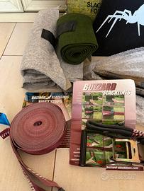 Vendo kit completo per slackline, ideale sia per principianti che per esperti. Il set è composto da componenti di alta qualità di due marchi leader del settore: Slackline Buzzard: Fettuccia robusta di colore rosso/bordeaux, completa di cricchetto (ratchet) con impugnatura ergonomica per un tensionamento facile e sicuro. Supporti Spider Slacklines (A-Frames): Strutture a "A" in legno/materiale tecnico nero, fondamentali per montare la slackline in giardino o in spazi aperti anche in assenza di alberi (utilizzando i picchetti). Accessori inclusi: Set di picchetti professionali in acciaio per ancoraggio al terreno. Protezioni per alberi in feltro (grigie e verdi) per non danneggiare la corteccia. Manuale d'istruzioni originale Buzzard "First Steps". Scatola originale Spider Slackline Il materiale è in ottime condizioni, i picchetti presentano solo la normale ossidazione superficiale dovuta all'inserimento nel terreno che non ne pregiudica la funzionalità. Perfetto per allenare equilibrio e coordinazione all'aperto. #slackline #equilibrio #sportaperto #spiderslackline #buzzard #fitness.