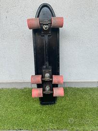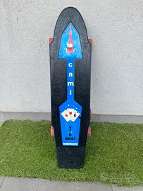 Skate marca CAMI, 3 assi 6 ruote. Articolo molto raro, da collezione, vintage fine anni ‘70. Colore nero, misure cm. 68x18 ca. Perfettamente funzionante, cuscinetti e gommini in ordine, viteria originale. Le condizioni estetiche sono buone, con normali ed ovvi segni di usura dovuti all’età.