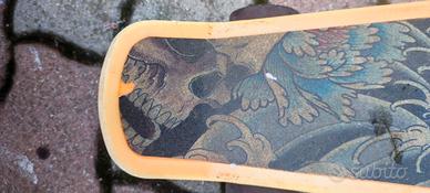 Skateboard con un design unico ispirato ai tatuaggi.