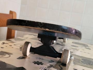 Come da titolo, vendo questo skateboard anni 90 inerente al marchio Goosebumps (Piccoli Brividi), sottocategoria Goosebumps Sport 1996/1996. Prezzo trattabile, ascolto offerte. In condizioni generali molto buone, è stato usato dal precedente proprietario, ma è ancora in buono stato, perfettamente funzionante. Tutte parti originali, la deck e i carrelli sono ancora integri nonostante qualche segno del tempo e di utilizzo (visibili in foto), così come le ruote, che nonostante qualche segno di usura hanno mantenuto il logo e i colori originali. Anche le giunture, le viti e i bulloni, tutti originali, sono ancora integri, senza segni di deterioramento. In ottime condizioni anche l'artwork di Curly lo scheletro sotto alla deck, celebre prima "mascotte" dei Piccoli Brividi dal 1995 al 1998/99. Su richiesta, se interessati, posso mostrare altre foto relative alle condizioni dello skateboard. Ritiro a mano in zona Bellusco e dintorni, spedizione solo su richiesta dell'acquirente. Per altre info contattatemi in privato.