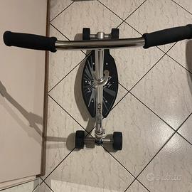 Skateboard con manubrio regolabile in altezza e pedana orientabile che segue il peso del corpo grazie a due snodi. Ruote in gomma.