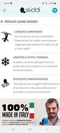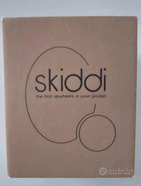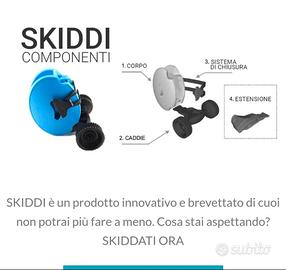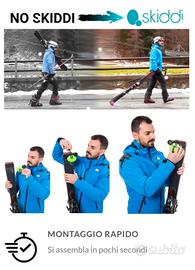 SKIDDI è il primo mini-trolley tascabile per agevolare il trasporto manuale degli sci.Si applica agevolmente alle code degli sci, e grazie a rotelle estraibili, consente di trainarli a mo’ di trolley in modo facile e sicuro. È piccolo, leggero, colorato, funziona su tutte le superfici e si adatta a tutte le tipologie di sci,