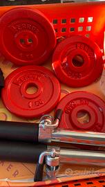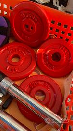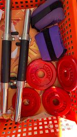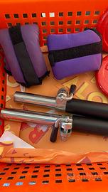 2 sbarre per sollevamento pesi, n. 2 piattelli da 0,5kg/cad, n. 2 piattelli da 1kg/cad, n.2 pesi morbidi con velcro