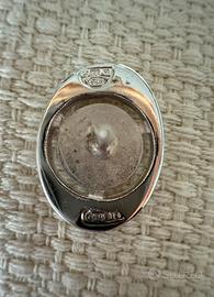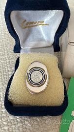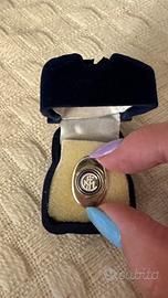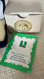 Spilla vintage ufficiale della F.C. Inter dal design ovale realizzata in argento sterling 925/1000, come indicato dal certificato di garanzia di Paterna & Livi s.r.l. e dal marchio impresso sul retro Nella confezione originale che include una scatoletta bianca con il logo dorato e un astuccio in velluto blu a forma di orsetto Dimensioni h cm 2 In perfette condizioni