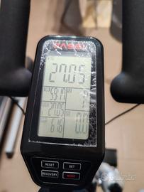 Caratteristiche: peso gruppo volano 25kg, computer, trasmissione a cinghia, borraccia e porta borraccia, fascia cardio.