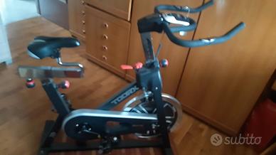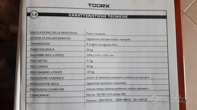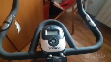 Spin bike TOORX montata, con scatola originale a disposizione, regolazione manuale verticale ed orizzontale, sensori di rilevazione pulsazioni cardiache, calorie, tempo, distanza. Misure 1070 x 510 x 1150 mm, peso 46 kg, peso utente 125 kg