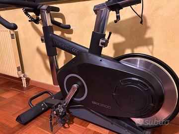 Spin bike Toorx Srx 3500-Scatto libero, trasmissione a cinghia con scatto libero. Sistema di frenaggio magnetico con regolazione elettronica dello sforzo. Massa volanica peso 24 kg, bilanciato. HEART RATE CONTROL. Ricevitore wireless integrato e fascia cardio inclusa. APP READY. iConsole App (scaricabile). Kinomap Fitness App (compatibile). Trasmissione a cinghia con scatto libero Sistema di frenaggio/resistenza magnetico con regolazione elettronica dello sforzo, Massa volanica peso 24 kg, Console con display LCD. Alimentazione a corrente 220 V, regolazione verticale e orizzontale sella e manubrio, sgancio rapido SPD, peso 58 Kg. Fascia cardio e istruzioni uso.