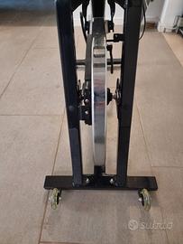 SPIN BIKE 4200 - Sistema frenante: tampone. - Regolazione freno: micrometrica. - Freno di emergenza: a pressione. - Pignone fisso. - Trasmissione: catena. - Cardio: palmare. - Portata max utente: 130 kg. - Ruote di trasporto: si. - Dimensioni: 114 x 50 x 106 cm. - Volano: 24 kg.
