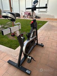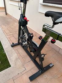 Spinbike con trasmissione a cinghia con pignone fisso, sistema di frenaggio a pattini con feltri. Dotato di leva di sicurezza per il bloccaggio rapido del volano e massa volanica