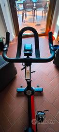 Spinbike con trasmissione a cinghia con pignone fisso. Sistema di frenaggio a tampone con feltri. Dotato di leva di sicurezza per il bloccaggio rapido del volano. Massa volanica peso 22 kg (bilanciato) Ricevitore wireless per fascia cardio integrato non funzionante.Tutti i dettagli sul sito del produttore Toorx