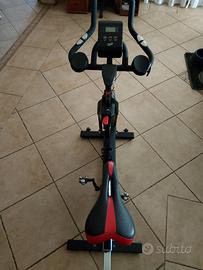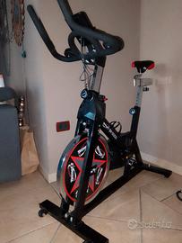 Tecnofit Indoor bike Professional con Volano 25 kg Pignone fisso con regolazione della forza frenante per mezzo di un sistema di frizione e una leva d'emergenza per la sicurezza Permette esercizi molto intensi, con un comodo display Lcd regolazione dello sforzo ,freno di sicurezza e stabilità trasmissione a cinghia in Poli V , indistruttibile e molto silenziona. Pedali adattabili a diversi tipi di scarpe per un comfort senza manutenzione , comoda sella e posizione del manubrio per tutti gli utenti Molto utile facile con allenamenti più lunghi Ruote di trasporto trasferimento all'interno della casa Specifiche Lunghezza: 104 cm Larghezza: 64 cm Altezza 119 cm Peso massimo dell'utente 140 kg Questa è una Indoor bike di altissimo livello qualitativo, regolazione per utenti fino a 195 cm.