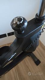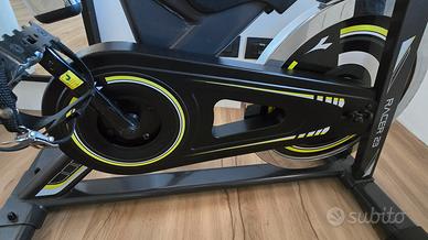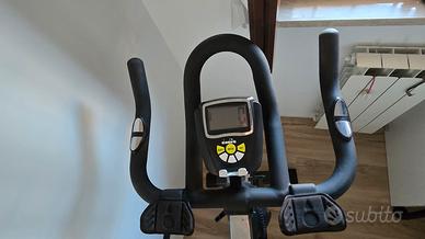 consente di effettuare allenamenti anche intensi e prolungati: è adatta sia al neofita che all'utente più esigente ed allenato fino a 120 kg di carico. volano da 23 kg, ottimo per affrontare buoni allenamenti e mantenere una pedalata di qualità, struttura resistente con una sella comoda bicolore ed un manubrio ergonomico, entrambi regolabili sia in altezza che a livello orizzontale: anche la persona con statura più alta non avrà problemi nel trovare l'assetto ottimale. Questa Fit Bike ha una trasmissione a catena e dei pedali racing bilanciati montati su pedivella a 3 pezzi per una perfetta fluidità di movimento; dispone di un pomello con doppia funzione: serve ad aumentare o diminuire lo sforzo di pedalata ma anche a bloccare il volano grazie al sistema di frenata a pattìno