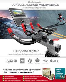 Sportstech SX600. La Cyclette si distingue per il volano da 26 kg, console Android da 7" offre la modalità gara e la simulazione della pista. Musica e video possono essere riprodotti direttamente o tramite ausilio di smartphone o tablet.