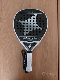Vendo pala da padel Starvie Triton,gomma EVA soft 30, forma a goccia e piatti in carbonio 3k in buone condizioni, tranne un salto di vernice come si vede dalle foto, ma i piatti sono perfetti