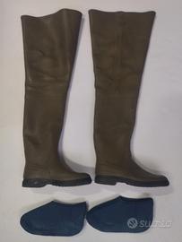 Marca Aigle , francese , altezza 84 cm manca un aggancio nello stivale e l'altro è leggermente tagliato come le foto dimostrano, il resto è un ottime condizioni suola compresa, numero 44 con pantofola interna