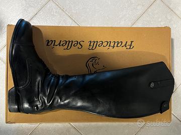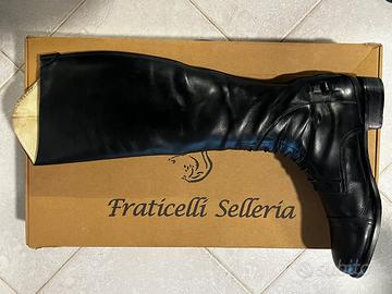 Stivali equitazione in cuoio di colore nero lacci anteriori e apertura posteriore, taglia 46 altezza 52 polpaccio 38.