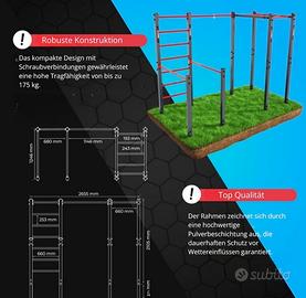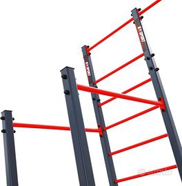 Struttura robusta in acciaio verniciato a polvere, perfetta per l’allenamento completo della parte superiore del corpo: trazioni, dip, esercizi alla spalliera, parallele e monkey bar.