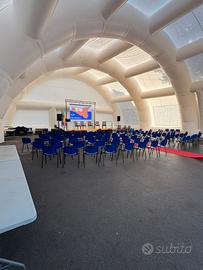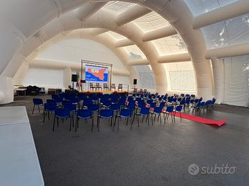 Struttura gonfiabile Smart Sport ad aria continua in poliestere resinato di PVC misure : 36.00 X 18.00 x 9.00 di altezza. Dotata di 4 motori monofase assiali 220 v/150 Watt piú 4 motori extra a corredo!! Dotata di occhielli interni ed esterni! 2 teli in poliestere misure 16.00 X 8.00 m Struttura adatta per Calcetto,Tennis, Padel o semplicemente per Meeting all'aperto poiche semplice da montare e comoda da trasportare.. il prezzo non é comprensivo di IVA..