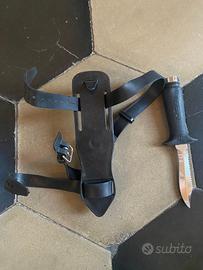 Il fodero in materiale plastico ha un tradizionale fermo elastico per trattenere il coltello e passaggi per agganciare il coltello al polpaccio o in cintura. Il coltello viene fornito di serie con due cinghioli per il fissaggio al polpaccio.