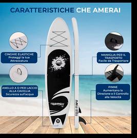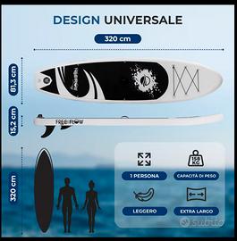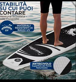SUP gonfiabile da spiaggia, ideale per uscite rilassanti, escursioni in acqua piatta e divertimento estivo. Grazie alle sue dimensioni generose 325x81x15,2 cm, offre un’ottima stabilità ed è adatto sia a principianti sia a utenti che cercano una tavola comoda e versatile. La struttura è progettata per garantire buon equilibrio, facilità di utilizzo e una portata elevata fino a 450 lbs, rendendolo perfetto anche per chi desidera maggiore sicurezza in acqua o più spazio a bordo. La pressione di gonfiaggio consigliata è 12-15 PSI, per ottenere il giusto compromesso tra rigidità e comfort. Il design fresco e moderno in tonalità acqua lo rende ideale per l’utilizzo in spiaggia, lago o mare calmo. Una soluzione pratica per chi vuole un SUP facile da trasportare, semplice da gonfiare e pronto all’uso in poco tempo. Caratteristiche principali: Dimensioni: 325 x 81 x 15,2 cm Portata massima: 450 lbs Pressione ottimale: 12-15 PSI Tavola stabile e versatile Ideale per mare calmo, lago e tempo libero