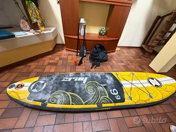 SUP gonfiabile: una tavola da stand up paddle. Heinz 9’9” Dimensioni: Lunghezza : 295cm Larghezza : 70cm Utilizzabile per un peso massimo di 130 kg rivestimento antiscivolo sopra e rinforzi sui bordi per aumentare resistenza e durata. Comprende: - kit di riparazione - borsone per trasporto - kit di gonfiaggio - Remo 170 cm - pinna direzionale In ottime condizioni ✨ Sempre lavato con acqua dolce e sapone neutro e riposto in borsone con borotalco ed evitando creazione di eventuali pieghe. Sfruttabile sia al mare (tiene molto bene le onde) sia al lago (si sconsiglia torrenti) 🌊