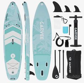 SUP NUOVO, mai utilizzato, progettato per offrire prestazioni elevate e massima versatilita. Lunghezza 335 cm: garantisce grande stabilita e spazio, ideale anche per salire in due senza problemi (portata fino a circa 200 kg). Dotato di predisposizione per seduta kayak, così puoi trasformarlo facilmente e usarlo anche da seduto per escursioni più lunghe o rilassate. Presente anche attacco per action cam (tipo GoPro) per riprendere ogni uscita in acqua. Struttura rinforzata ad alta pressione per una rigidità superiore rispetto ai SUP standard. Diverse maniglie strategiche (centrale, anteriore, posteriore e supporto piedi) per trasporto e controllo ottimali in ogni situazione. Set completo incluso: pagaia regolabile, pompa, leash di sicurezza, pinne removibili, zaino da trasporto e accessori. Pronto all'uso fin da subito, senza necessità di acquistare altro. Un SUP di fascia alta, pensato per chi vuole qualità, sicurezza e un'esperienza superiore in acqua.