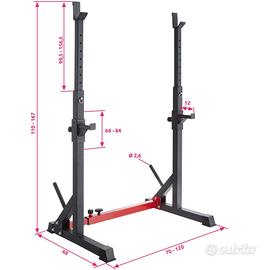 Squat Rack, Regolabile in Altezza e Larghezza, Supporti Bilanciere Superiori e Laterali con Gomma, In Acciaio, Supporti per Dischi,
