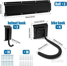 l pacchetto include: 4 ganci per bicicletta + 2 ganci per casco + 2 binari di guida per ganci, specifiche per gancio per bicicletta 75 * 160 * 110 mm, specifiche per casco 100 * 38 * 2 mm, specifiche per piastra 405 * 100 * 2 mm, adatte per il parcheggio di 4 biciclette.