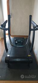 Tapis roulant curvo - privo di motore, l'utente muove il nastro in base all'allenamento - camminata o corsa. Il movimento e la velocità della corsa viene generata dallo stesso utilizzatore in maniera semplice ma allo stesso tempo intensa.Design innovativo ideato per migliorare potenza, velocità e resistenza anche ad alti livelli. Il display lcd oltre a conteggiare il tempo, la distanza, la velocità di movimento, le calorie, ha anche la possibilità di regolare la resistenza meccanica della corsa tramite pomello che agisce sul meccanismo magnetico. Impugnature ergonomiche consentono un allenamento ancora più intenso e un esercizio cardio ad alto livello Schermo LCD con diverse funzioni: allenamento a intervalli, timer per il conto alla rovescia, FC, conteggio distanza, velocità, tempo, calorie Dimensioni piano da corsa di corsa: 50 x 165 cm. 8 livelli di resistenza magnetica Ruote anteriori e maniglia posteriore per un facile spostamento Peso max utente consentito: 200 kg Dimensioni: 185 x 87 x 146 cm Peso netto: 73 kg
