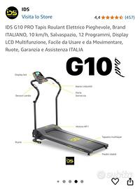 IDS G10 PRO tapis roulant elettrico pieghevole, brand italiano, salvaspazio display LCD multifunzionale, facile da usare e movimentare con ruote.