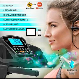 Bluetooth compatibile con APP dedicate (KINOMAP, ZWIFT, etc.) per allenamento online, interattivo, multiplayer, training, video coaching, streaming e molto altro. Altoparlanti integrati e display multifunzione digitale LCD con tasti di scelta rapida. Supporto per tablet e smartphone. Chiave di sicurezza inclusa