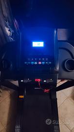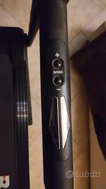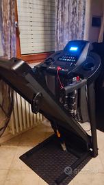 Tapis roulant Bakaji usato raramente per camminata. Con cassa integrata bluetooth, supporto per smartphone o tablet e due porta borraccia. Velocità massima 12 kmh, dimensioni del nastro 120cm x 40cm. Sensori battito cardiaco