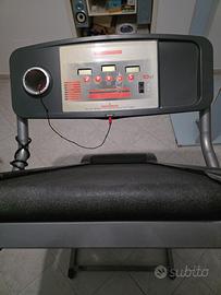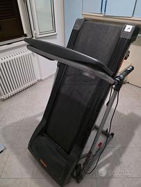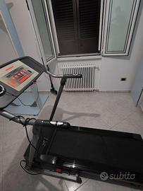 Tapis roulant elettrico con console integrata per il monitoraggio dei dati. Include programmi di allenamento, sensori di frequenza cardiaca sui manubri e impostazioni per regolare la velocità e la salita. Struttura pieghevole per risparmiare spazio quando non in uso. In buone condizioni.