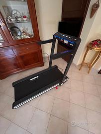 tappeto corsa cm 48×130 inclinabile elettricamente fino al 15%, velocità 18 km/h, ampio display con indicazione inclinazione piano, velocità, tempi, km percorsi, calorie, rilevazione cardiaca. Computer con 39 programmi preimpostati, collegabile in bluetooth con app Fitshow allo smartphone. Il tapis roulant è dotato di altoparlanti integrati ed è totalmente richiudibile.