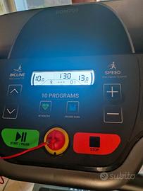 Inclinazione fino al 10%, velocità fino a 13 km orari, stabile in quanto pesante, kg 60, porta le rotelle rosse posteriori così si può trasportare in qualsiasi stanza, magari davanti ad una TV o stereo richiudibile quando nn è in uso, così da occupare meno spazio.