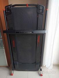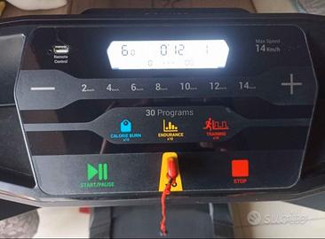 La velocità massima è di 14 km/h, facilmente regolabile con i 7 tasti di scelta rapida, i tasti + e - e il telecomando in dotazione al tapis roulant.