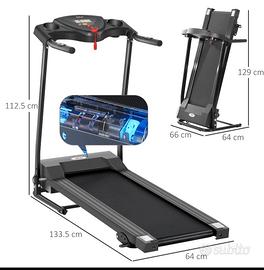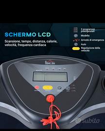 Schermo LCD che segnala il tempo, la distanza, calorie bruciate ,frequenza cardiaca; velocità regolabile, tre livelli di programmi preimpostati, angolazione della base regolabile per svolgere allenamenti con intensità diversa, tre posizioni regolabili per la corsa, pulsante arresto di emergenza, regolazione della velocità, tre livelli di corsa, sistema dì ammortizzazione, pieghevole e trasportabile tramite ruote.