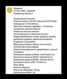 Vendo in ottime condizioni,tapis roulant elettrico professionale Oliviero: display digitale retro illuminato, rilevazione battito cardiaco con sensori su maniglie, ampia superficie di marcia superiore a 1,2 mt. Velocità max 16 km/ h, 3 livelli di inclinazione. Ruote anteriori per facilitare lo spostamento, richiudibile, occupa poco spazio. Chiave di arresto di sicurezza. Non spedizione, solo ritiro diretto. No affaristi e perditempo, prezzo poco trattabile. L'oggetto è imballato e sanificato. Possibile visionarlo se interessati.
