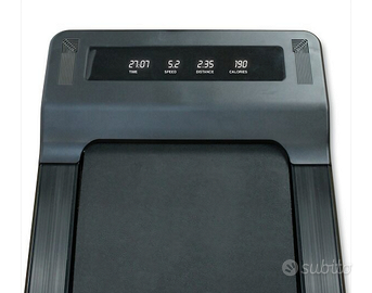 Modello P 982017 SLIM tapis roulant elettrico ultra sottile di Rovera, data di acquisti 05.09.2022 Struttura in acciaio, motore DC, 220-240V, 50-60 Hz. Velocità da 1 a 8 km/h Barra manubrio e ruote di trasporto Tappeto corsa 120x40 cm Display LED sulla base con visualizzazione tempo, distanza, velocità, calorie, 6 programmi di allenamento Casse audio integrate con connettività Bluetooth Smartwatch per controllo funzioni Stop di sicurezza magnetico Peso max atleta kg 120