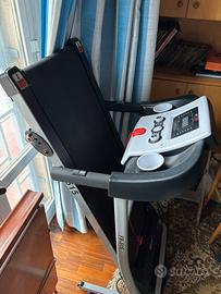 Modello pieghevole salvaspazio, ideale per camminata e corsa leggera. Dotato di display LCD, sensori cardio, ingresso USB e AUX per la musica. Era di una persona anziana quindi utilizzato poco e a bassa velocità.