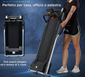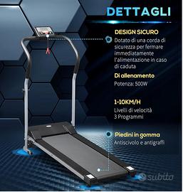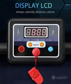 VELOCITÀ REGOLABILE: Questo tapis roulant elettrico ha velocità regolabile tra 1-10km/h, ideale per fare jogging e camminate sostenute. PIEGHEVOLE: Finito l'allenamento, ripiegalo e sistemalo sotto al letto o in ripostiglio. Occupa pochissimo spazio e grazie alle 2 ruote puoi spostarlo in totale autonomia. SCHERMO LCD: Tieni sotto controllo i tuoi risultati e traccia tempo, velocità, distanza e calorie bruciate. SICURO: Questo tapis roulant pieghevole è dotato di una corda di emergenza. Puoi fissarla ai tuoi indumenti e, in caso di caduta, bloccherà immediatamente l'attrezzo. DIMENSIONE: Dimensione generale: 122L x 62.5P x 119Acm. Dimensione da piegato: 28.5L x 61P x 124Acm.