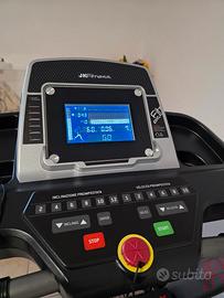 informazioni display: distanza, pulsazioni, tempo, calorie, velocità, inclinazione, programmi preimpostati, tasti rapidi x inclinazione e velocità con aumento/diminuzione di 0,1 km sul manubrio con misurazione battiti cardiaci su barra frontale