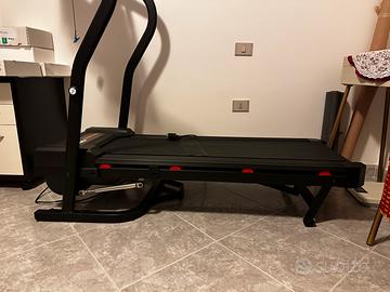 Il prodotto nell'immagine è un tapis roulant della marca Works, modello Performance Treadmill. Caratteristiche: Include un portabottiglie, un portasciugamani e un portaccessori. Funzioni: Monitora distanza, velocità, tempo, calorie e inclinazione. Sicurezza: È dotato di una chiave di sicurezza da inserire per l'attivazione. È come nuovo senza alcun segno di usura vendo per inutilizzo